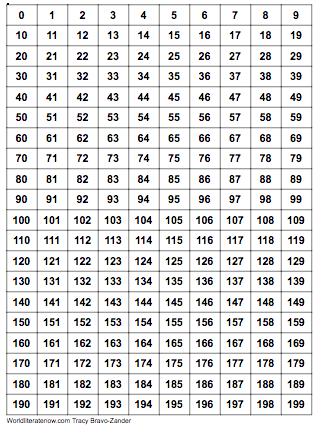 This number chart is custom made to include zero to one hundred ninety- nine for more dynamic math activities! It is excellent for: addition, subtraction; multiplication, division and anything beyond the basics too. I have lessons available for each of those skill sets.