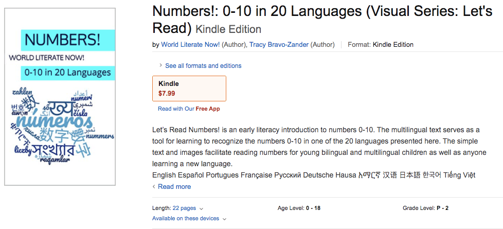 An early literacy introduction to reading numbers 0-10, the multilingual text serves as a tool for learning to recognize the numbers 0-10 in one of the 20 languages presented here. It facilitates learning numbers for bilingual and multilingual children as well as anyone learning a new language.